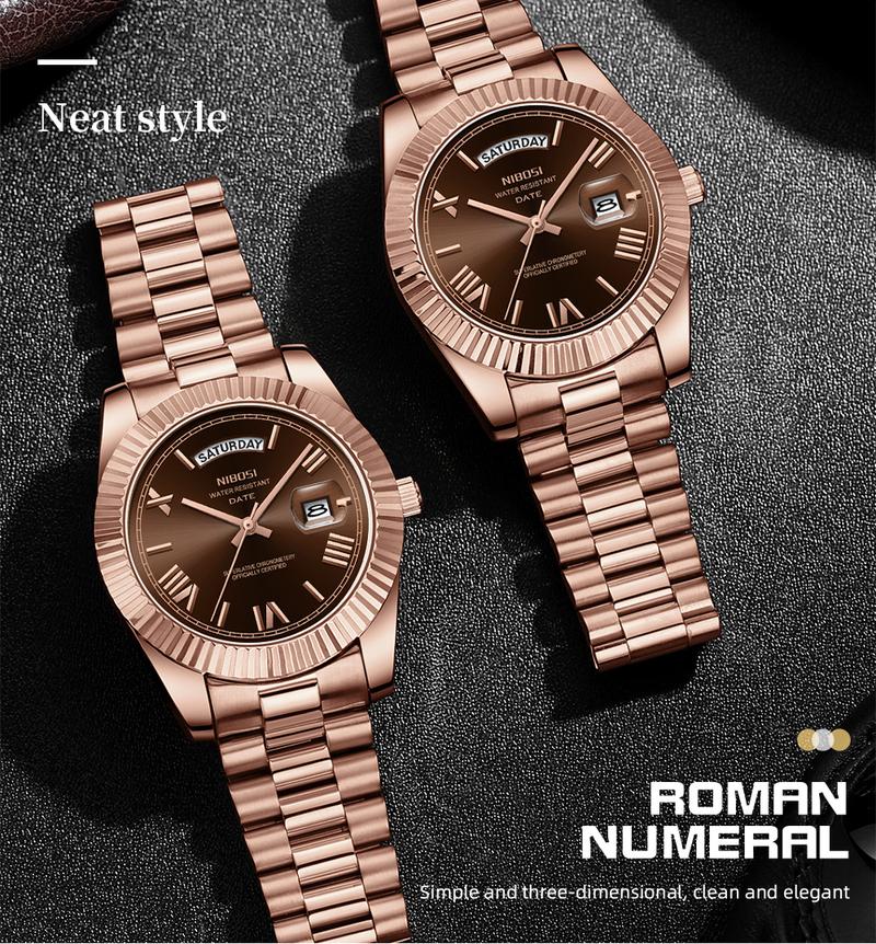 NIBOSI Men'S Luxury Dress Watch 40Mm Rose Gold Dial Stainless Steel Band Rotating Quartz Analog Waterproof Luminous Big Face Boss Wrist Watch