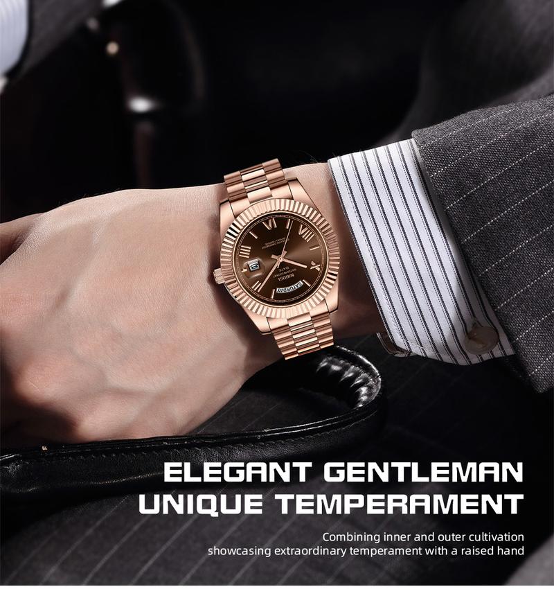 This men's luxury dress watch features a 40mm rose gold dial, perfect for casual and business settings. The stainless steel band ensures durability and longevity. Ideal for daily wear, it offers convenience and durability. Add a touch of fashion to any outfit with this versatile watch.